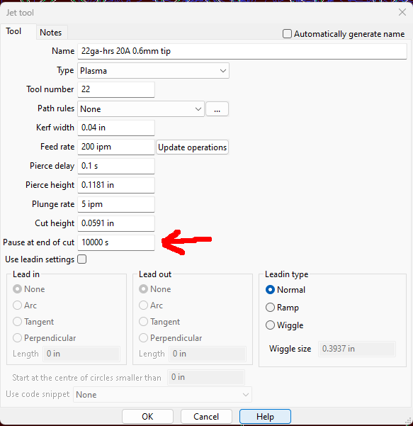 Here’s my question, I want a 10 second cooldown pause before or after each cut. I’ve tried all the rules (on start, before end, lead in and out, etc) and can’t get sheetcam to insert my code snippet when the torch is off. Can I do this with rules or will I have to modify my post code?