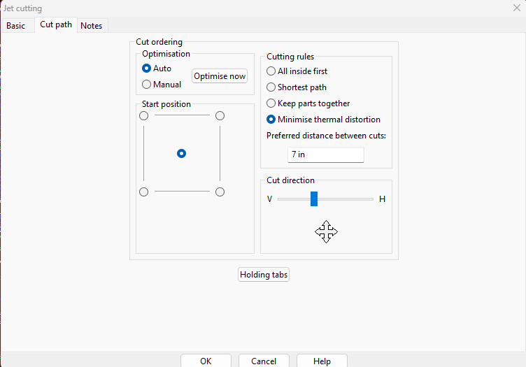 In your cut operation go to the ‘cut path’ tab and enable ‘minimise thermal distortion’ and set the distance to something like half the width of your part.