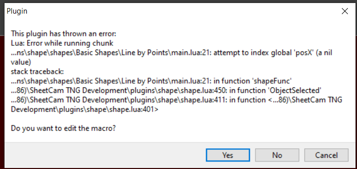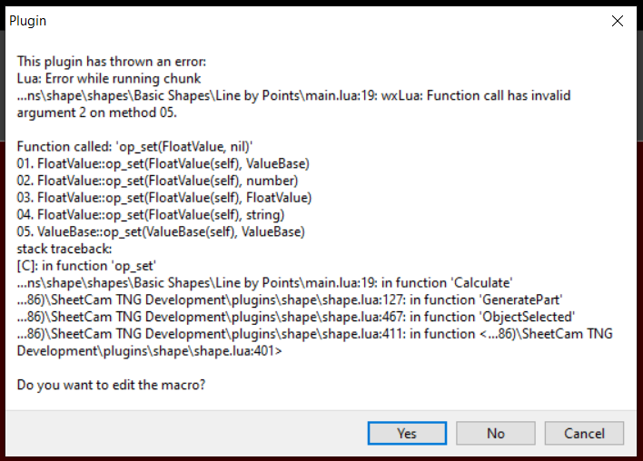 Run SheetCam as administrator then go to Options->plugin options->shape and click on the 'Edit macro" button.