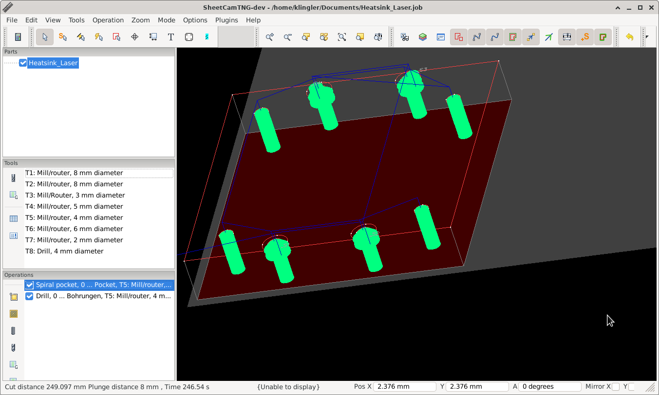 Have SheetCAM 7.1.35 here on Debian Linux and trying to make a simple job based on a 4mm milling tool which involves pocketing and drilling.