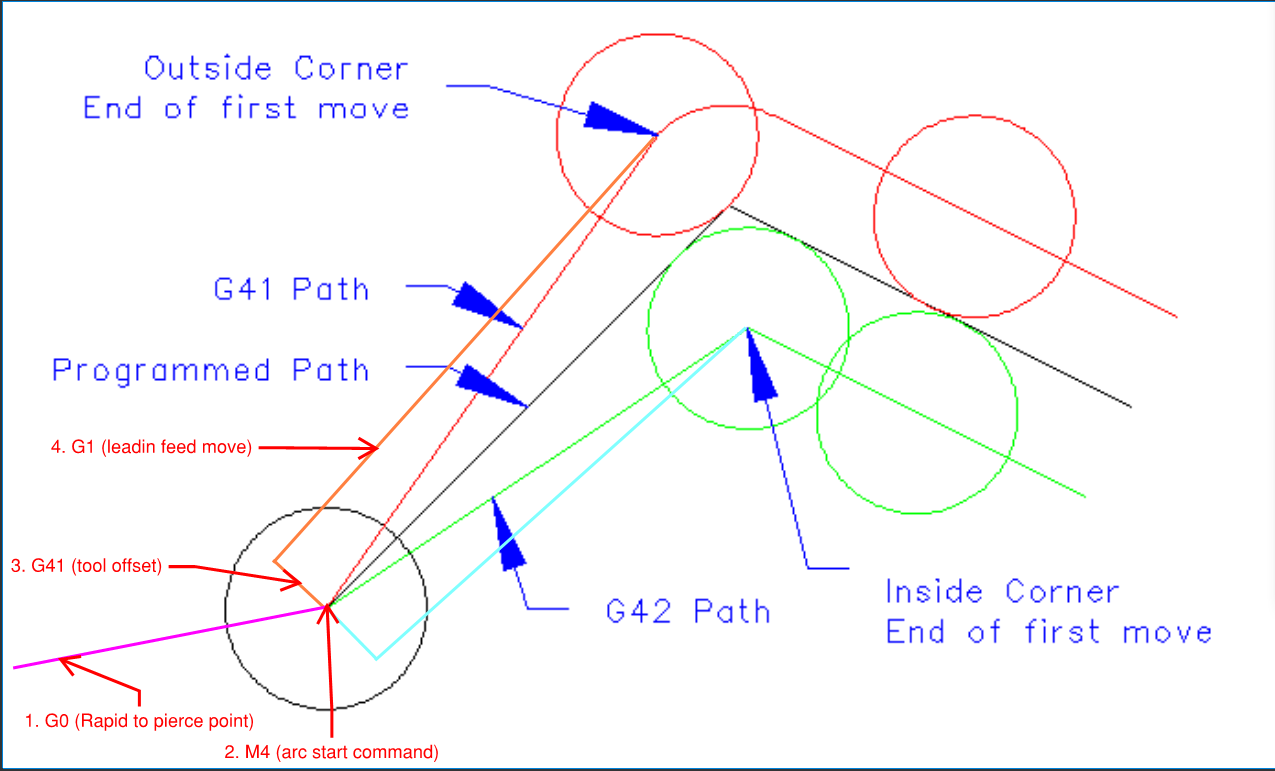 G41 (tool offset, head moves perpendicular to cut path in the next block)