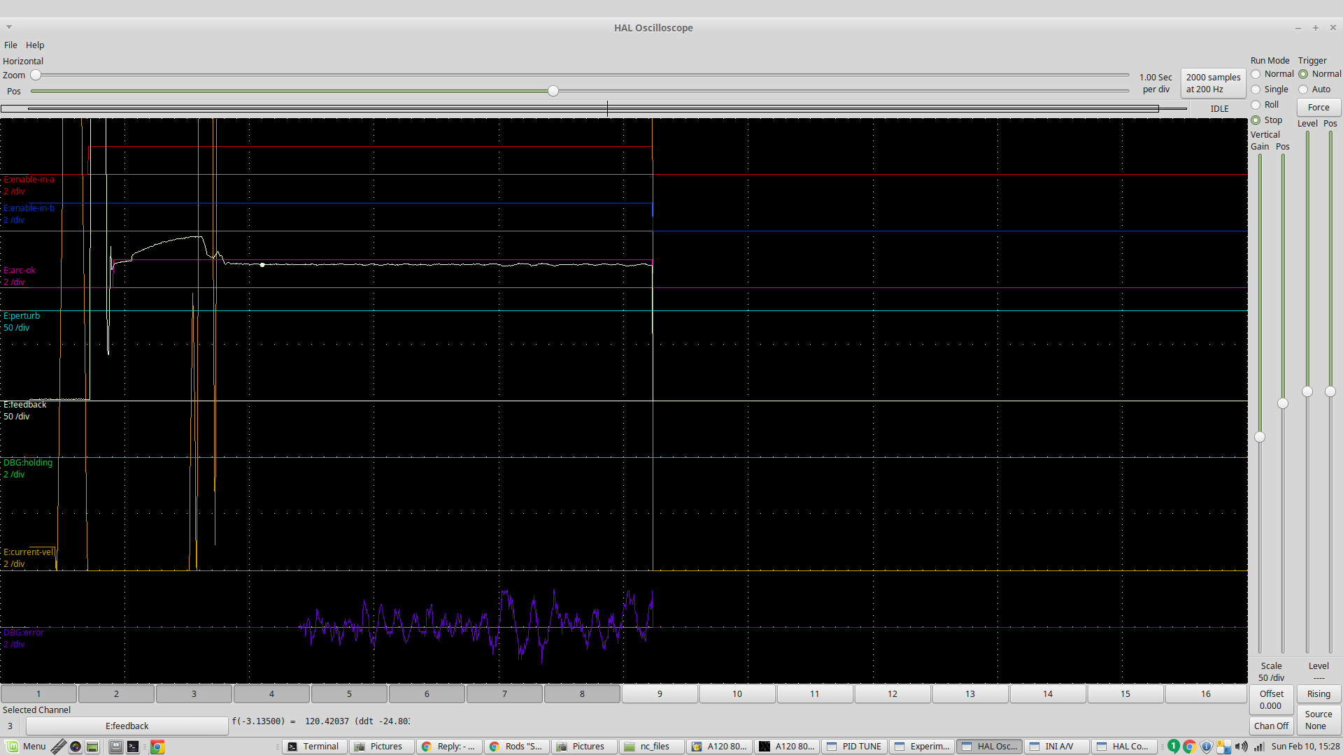 You can see the THC is enabled at the point where the blue error line starts to be plotted (1.5 seconds after arcOK goes true). This period could be shortened a bit in this instance but 16mm thick material is a bit slower settling.