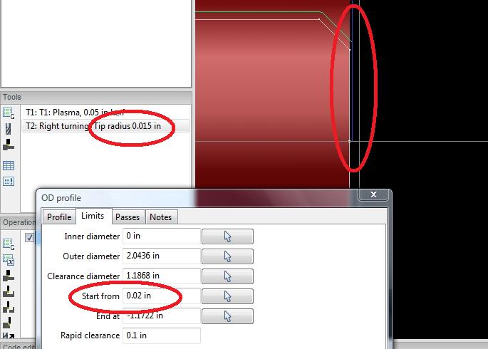 tip radius. Here I have .020" for cleanup but the tool refuses to go there.