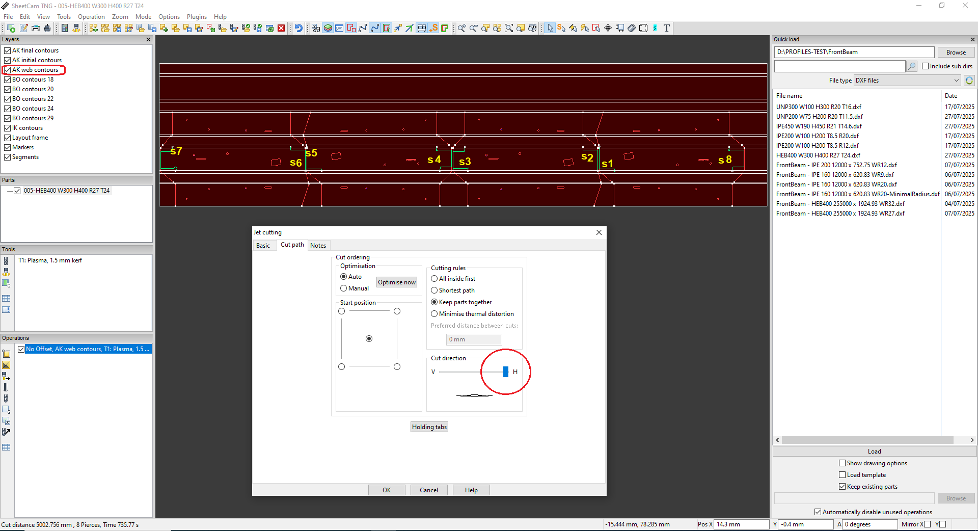 DGNest has a new layer (web contours for V-section of the I-beam). As you can see from the image I am using horizontal direction in Operations->Cut path and the same cut direction in Job options. Cut order is not as expected.