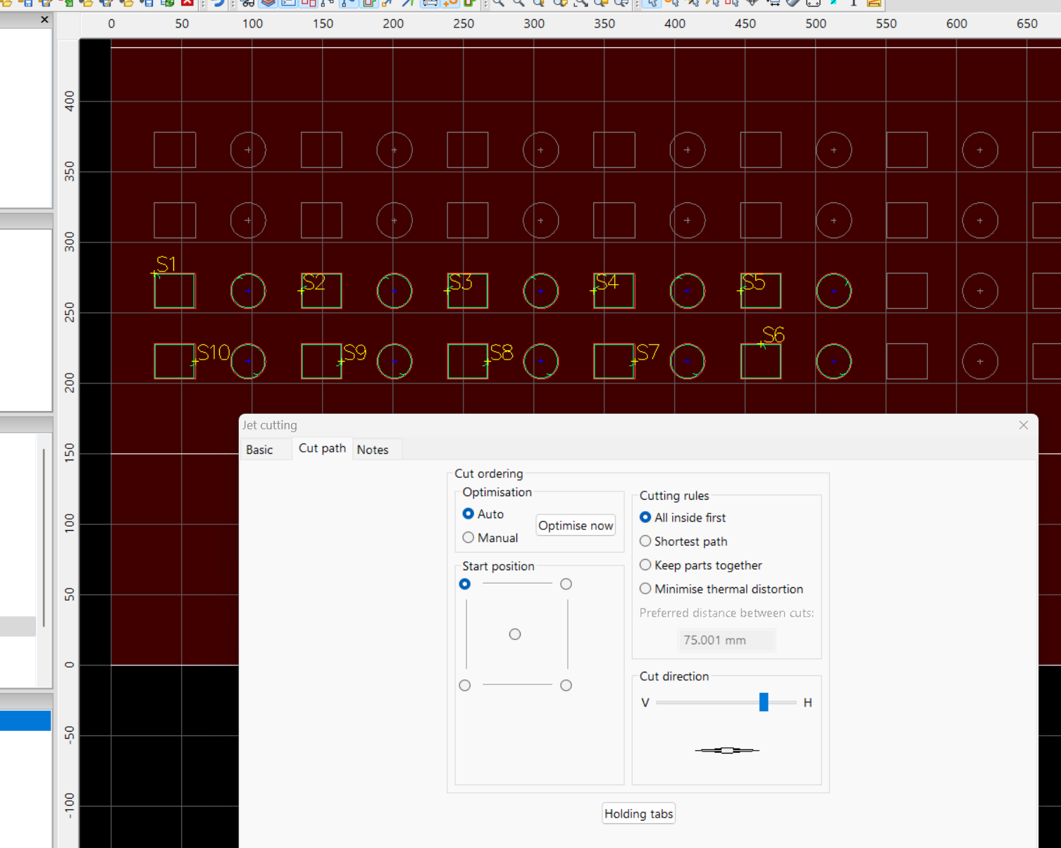 Sheetcam has several automatic cut order optimization features available. Let’s start with Operations / ‘Cut path’ dialogue. There are several controls and algorithms to select and experiment with. Similar controls can be found in Options / ‘Job options’ / Nesting which act on Parts/Operation packages. And of course the third is fully manual which is what you have discovered via Mode / ‘Start points’ / ‘Quick sequence’. Note the use of the Horizontal and Vertical sliders in the first two automatic optimization settings, this gives preference to those respective directions. In concert with all of these choices is the Layer element, which groups contours for isolation to specific Operations and tool choices.